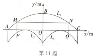 11. (2025·陕西)某景区大门上半部分的截面示意图如图所示,顶部 $ L_{1} $,左、右门洞 $ L_{2} $,$ L_{3} $ 均呈抛物线型,水平横梁 $ AC = 16m $,$ L_{1} $ 的最高点 $ B $ 到 $ AC $ 的距离 $ BO = 4m $,$ L_{2} $,$ L_{3} $ 关于 $ BO $ 所在直线对称。$ MN $,$ MP $,$ NQ $ 为框架,点 $ M $,$ N $ 在 $ L_{1} $ 上,点 $ P $,$ Q $ 分别在 $ L_{2} $,$ L_{3} $ 上,$ MN // AC $,$ MP \perp AC $,$ NQ \perp AC $。以 $ O $ 为原点,$ AC $ 所在直线为 $ x $ 轴,$ BO $ 所在直线为 $ y $ 轴,建立平面直角坐标系。