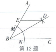 12. (2025·资阳)如图, 在射线 $ BA, BC $ 上, 分别截取 $ BM, BN $, 使 $ BM = BN $, 再分别以点 $ M $ 和点 $ N $ 为圆心、大于 $ \frac{1}{2}MN $ 的长为半径作弧, 在 $ \angle ABC $ 内, 两弧交于点 $ D $, 作射线 $ BD $, 过点 $ D $ 作 $ DE // BC $ 交 $ BA $ 于点 $ E $. 若 $ \angle BDE = 30^{\circ} $, 则 $ \angle AED $ 的度数是 (