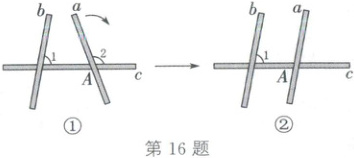 16. (2025·甘肃)如图①, 三根木条 $ a, b, c $ 相交成 $ \angle 1 = 80^{\circ}, \angle 2 = 110^{\circ} $, 固定木条 $ b, c $, 将木条 $ a $ 绕点 $ A $ 顺时针转动至如图②所示的位置, 若要使木条 $ a $ 与木条 $ b $ 平行, 则可将木条 $ a $ 旋转 (