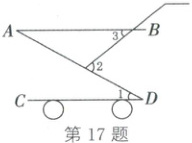 17. (2025·烟台)如图所示为一款儿童小推车的示意图, 若 $ AB // CD, \angle 1 = 30^{\circ}, \angle 2 = 70^{\circ} $, 则 $ \angle 3 $ 的度数为 (