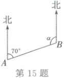 15. (2025·苏州)如图, 在 $ A, B $ 两地间修一条笔直的公路, 从 $ A $ 地测得公路的走向为北偏东 $ 70^{\circ} $. 若 $ A, B $ 两地同时开工, 要使公路准确接通, 则 $ \angle \alpha $ 的度数应为 (