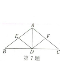 7. (2025·福建)某房梁如图所示,立柱$AD\perp BC$,$E$,$F$分别是斜梁$AB$,$AC$的中点.若$AB=AC=8\mathrm{m}$,则$DE$的长为
