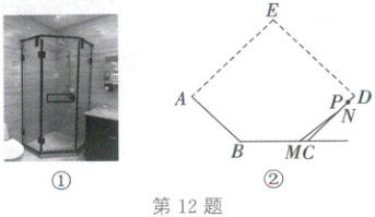 12. (2025·江西)如图①所示为一种靠墙玻璃淋浴房,其俯视示意图如图②所示,$AE$与$DE$两处是墙,$AB$与$CD$两处是固定的玻璃隔板,$BC$处是门框,测得$AB=BC=CD=60\mathrm{cm}$,$\angle ABC=\angle BCD=135^{\circ}$,$MN$处是一扇推拉门,推动推拉门时,两端点$M$,$N$分别在$BC$,$CD$对应的轨道上滑动.当点$N$与点$C$重合时,推拉门与门框完全闭合;当点$N$滑动到限位点$P$处时,推拉门推至最大,此时测得$\angle CNM=6^{\circ}$.