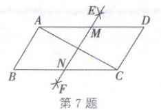 7. (2025·齐齐哈尔)如图,在$□ ABCD$中,$BC=2AB=8$,连接$AC$,分别以点$A$,$C$为圆心,大于$\frac{1}{2}AC$的长为半径作弧,两弧交于点$E$,$F$,作直线$EF$,交$AD$于点$M$,交$BC$于点$N$.若$N$恰为$BC$的中点,则$AC$的长为