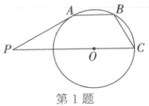 1. (2025·福建)如图,PA 与⊙O 相切于点 A,PO 的延长线交⊙O 于点 C,AB//PC,且交⊙O 于点 B. 若∠P = 30°,则∠BCP 的度数为(