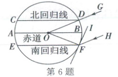 6. (2025·北京)如图,⊙O 是地球的示意图,其中 AB 表示赤道,CD,EF 分别表示北回归线和南回归线,∠DOB = ∠FOB = 23.5°. 夏至日正午时,太阳光线 GD 所在直线经过地心 O,此时点 F 处的太阳高度角∠IFH(即平行于 GD 的光线 HF 与⊙O 的切线 FI 所成的锐角)的度数为