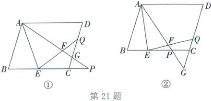 21. (2025·成都)如图,在$□ ABCD$中,点$E$在$BC$边上,点$B$关于直线$AE$的对称点$F$落在$□ ABCD$内,射线$AF$交射线$DC$于点$G$,交射线$BC$于点$P$,射线$EF$交$CD$边于点$Q$。