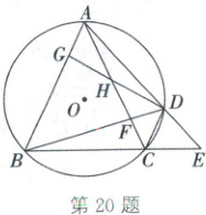 20. (2025·福建)如图,四边形$ABCD$内接于$\odot O$,$AD$,$BC$的延长线相交于点$E$,$AC$,$BD$相交于点$F$。$G$是$AB$上一点,$GD$交$AC$于点$H$,且$AB = AC$,$BG = DG$。