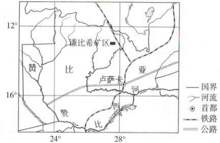 20世纪初,随着当地铜矿资源的开发,谦比希发展成为“世界铜矿之都”,2014年开始,谦比希以较高的奖金鼓励各国企业进入,此后中国矿业公司迁入谦比希,建设铜冶炼基地。下图为谦比希地理位置示意图。读图,完成1~2题。