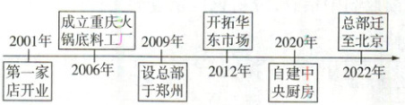 B 火锅餐饮企业起步于河南安阳,现已拥有超百家直营店、3个中央厨房、1个底料加工厂,店面覆盖北京、上海等30多个城市。该企业实施“底料工厂—中央厨房—餐厅”经营模式,通过集中采购、集约生产、统一配送等完成食品成品或半成品加工。下图为该企业发展历程示意图。据此完成8~9题。