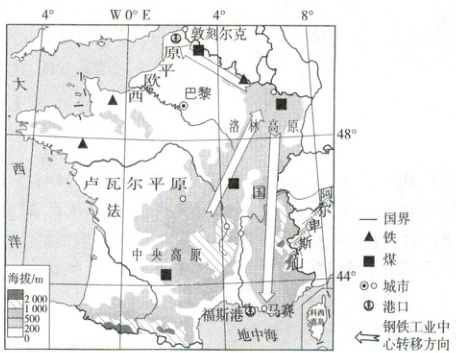 钢铁工业是法国工业的重要部门之一。法国钢铁工业的布局前后经历了几次较大的变化。目前,敦刻尔克港和福斯港两大沿海钢铁基地的钢产量已占到法国钢总产量的60%以上。读图,完成3~4题。