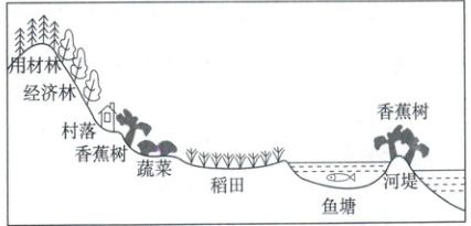 1.B 2.C 解析:1.图示农业生产模式,在山麓鱼塘附近种植对水分、热量需求较多的水稻;随着山坡海拔升高,热量条件下降,与水源地距离变远,种植经济林和用材林,故影响图中农业发展方向随海拔高度变化的主要自然因素是热量和水分。随着海拔升高,地形和土壤有变化,但水热条件的变化为主导因素;光照条件变化不明显;市场和政策不属于自然因素。2.读图可知,此处充分利用地形条件,修建了河堤、稻田、鱼塘,使其有利于农业活动,同时,鱼塘可为稻田提供灌溉水源,改善稻田水分条件,C项正确。
