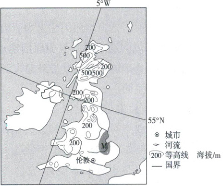 下图中阴影示意的M地区曾经是湿地(沼泽),年降水量是年蒸发量的1.2~1.5倍,远低于英国西部和北部。在罗马时代,人们对M地区湿地进行了排水尝试,湿地仅得到零星开垦。17世纪,该地引入荷兰风车与水利工程技术,湿地得到成片开垦。经过几百年的开发,M地区已经成为英国重要的农产品生产基地,但也存在诸多问题。