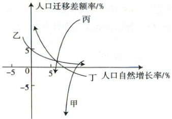人口迁移差额率=(迁入人口-迁出人口)/总人口×100%。下图示意我国甲、乙、丙、丁四地近几十年的人口变动情况。据此完成3~4题。