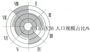(1)根据图示信息可知,Ⅱ区间人口规模占比小于15%,而Ⅳ区间人口规模占比大于15%,所以Ⅱ区间比Ⅳ区间人口规模小,A项错误;据图示信息可知,Ⅷ区间的人口规模占比最大,对应的人口数量最多,B项错误;Ⅵ区间人口数量比重大于10%,C项错误;Ⅶ区间人口规模占比大于10%,Ⅴ区间人口规模占比小于10%,故Ⅶ区间比Ⅴ区间人口规模大,D项正确。