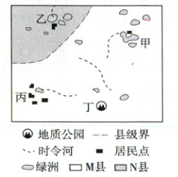 解析 读图可知,在M县区域内,甲地附近绿洲面积较大,原有居民点少,环境承载力较大,适合该村生态搬迁选址,A项正确。乙地不在M县,丙地附近原有居民点已经较多,丁地附近是地质公园,且没有绿洲分布,都不适宜该村选址。