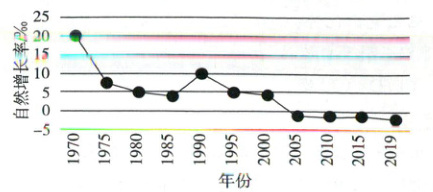 6.[2022·重庆卷]常住人口指在某一地区经常居住的人,通常以是否持续居住半年以上为标准。户籍人口指户籍在某一地区的人。某市位于黄海之滨,南临长江,常住人口长期低于户籍人口。近年来,该市积极打造先进制造业基地,经济高速发展。2021年常住人口数量超过了户籍人口数量。右栏上图为该市户籍人口统计的1970—2019年人口自然增长率变化曲线。据此完成(1)~(2)题。