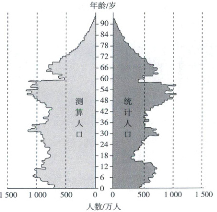 (1)读图可知,15~21岁测算人口数量与统计人口数量差异最显著,根据材料“在不考虑城乡人口迁移的条件下”可知,测算人口数量未考虑人口的迁移。