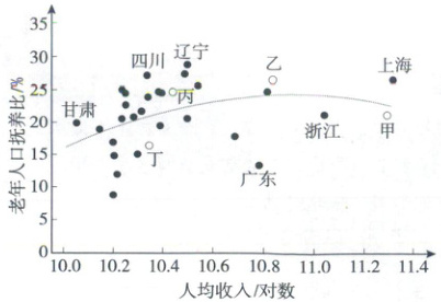 8.[2025·江苏卷]老年人口抚养比是指一个地区老年人口数与劳动年龄人口数的比值。右栏上图为2022年我国部分省级行政区老年人口抚养比与人均收入的关系图。据此完成(1)~(2)题。