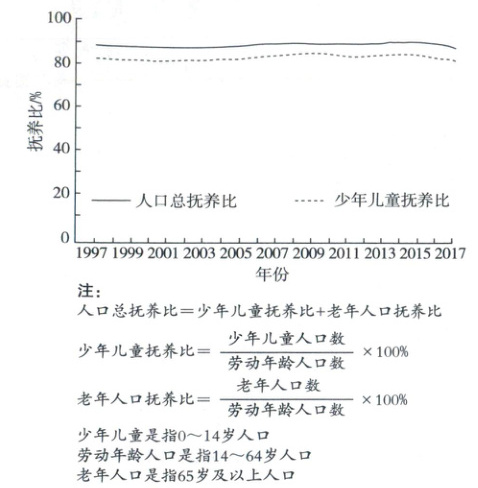 例4 [2025·山东卷]下图示意某人口大国1997—2017年人口总抚养比和少年儿童抚养比的变化。据此完成(1)~(2)题。
