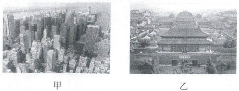 典例 下面图甲为纽约曼哈顿景观图,图乙为北京故宫景观图。据此完成(1)~(2)题。
