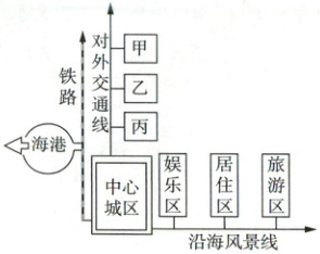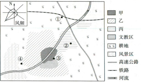 (2)指出图中丙代表的城市功能区,并从环境角度说明其布局的合理性。(6分)