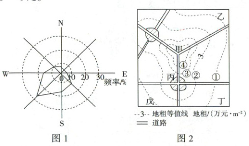 下面图1为某平原大城市风向频率图,图2为该城市地租分布等值线示意图,图中等值距为0.5。据此完成5~6题。