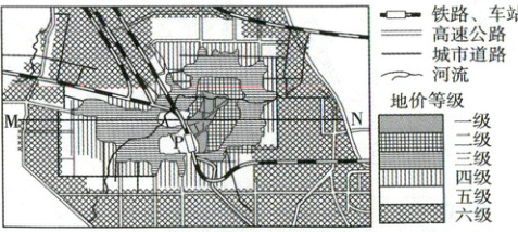 9.C 10.D 解析:9.读图可知,M—N一线穿过城市中心,根据由城市中心到郊区地价逐渐降低原则,M—N一线中间地价高,两边地价低,由于城市中心处有铁路穿过,受铁路影响地价稍低,在中心偏东一级地价处是地价最高的地方,C项正确。10.P区域位于市中心附近,靠近火车站,交通便捷,面积较大,地块规整;地价低的主要原因与其位于火车站附近,人流量多,噪声大有关。