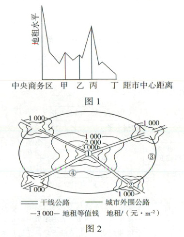 7.C 8.B 解析:7.图2中①处地租最高的主要原因是位于市中心,交通便捷。地租是影响中央商务区分布的主要因素,即因为①处地租最高,所以该处属于中央商务区,但是中央商务区不是①处地租最高的原因。地租的高低与居民文化水平关系不大。地租是影响居住区分布的因素,所以分布有高级居住区不是地租高的原因。8.丙地位于地租的次高峰处,所以应该位于城市外围的环形道路和放射道路的交会处,图2中①地位于城市中心,地租最高,大于3000元/米²,A项错误。②地位于城市外围的环形道路和放射道路的交会处,地租为2000∼3000元/米²,B项正确。③地地租小于1000元/米²,④地地租为1000元/米²,说明③④两地地租低,而丙地位于地租的次高峰处,所以C、D两项错误。