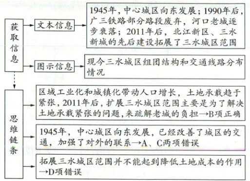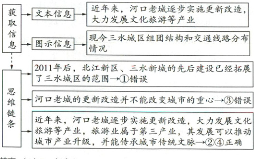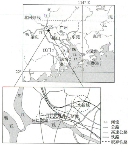典例 三水河口老城始建于明代,文化遗存多。1903年,广(州)三(水)铁路开通,河口老城因处在水陆转运枢纽而兴盛。1945年,中心城区向东发展;1990年后,广三铁路部分路段废弃,河口老城逐步衰落;2011年后,北江新区、三水新城的先后建设拓展了三水城区范围。近年来,河口老城逐步实施更新改造,大力发展文化旅游等产业。下图示意现今三水城区组团结构和交通线路分布。据此完成(1)~(2)题。