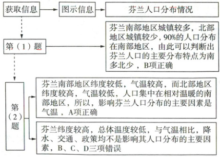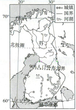 典例 下图示意芬兰人口分布。读图,完成(1)~(2)题。