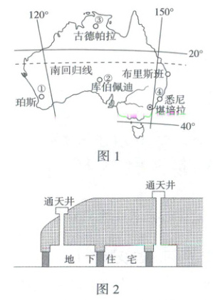 澳大利亚(下面图1)某地区降水稀少,自然景观极度荒凉,气温年较差大,夏季最高气温可达50 ℃,冬季气温较低。早年,该地区的矿工经常在矿井里躲避炎热天气,长此以往便形成了具有当地特色的地下住宅(下面图2)。据此完成9~11题。