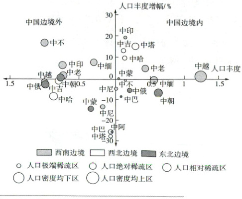 人口丰度指某地区的人口密度与所属国家人口密度的比值。下图示意2000年中国边境内外人口丰度和2000—2010年中国边境内外人口丰度的变化。据此完成13~14题。