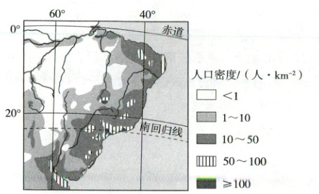 读下面南美洲部分地区人口密度分布图,完成10~12题。