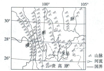四川省米易县地处青藏高原东南边缘横断山区,境内最低海拔980米,最高海拔3400多米,高山地区气候凉湿,河谷地区气候干热,光照充足,全年基本无霜。近年来米易县利用地形和气候优势大力发展杧果种植,现已成为我国重要的杧果种植基地,与海南、广西等杧果主产区形成竞争态势。下图为米易县位置示意图。