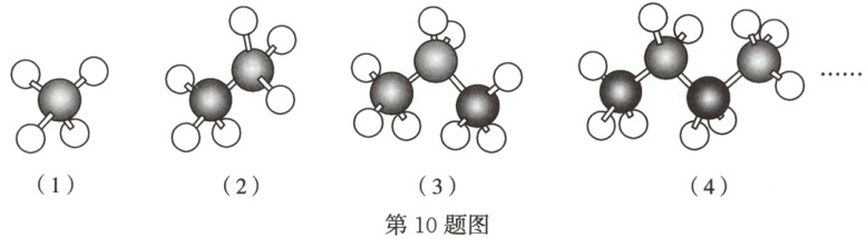 10. 烷烃是一类由碳、氢元素组成的有机化合物质,下图是这类物质前四种化合物的分子结构模型图,其中灰球代表碳原子,白球代表氢原子。如图,第1种有4个氢原子,第2种有6个氢原子,第3种有8个氢原子……按照这一规律,第10种化合物的分子结构模型中氢原子的个数是()