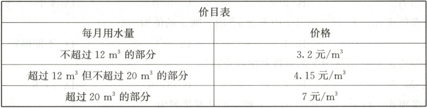 ③当超过$20m^{3}$的时,应缴水费3.2×12+(20-12)×4.15+7×(a-20)=7a-68.4(元)。