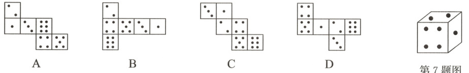 7. 如图,已知骰子相对两面的点数之和为7,下列图形为该骰子表面展开图的是()