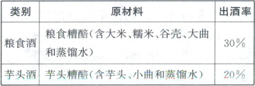 2. (2025·江西)如图,某文物考古研究院用$1:1$复原的青铜蒸馏器进行了蒸馏酒实验.用复原的青铜蒸馏器蒸馏粮食酒和芋头酒,需要的原材料与出酒率(出酒率$=\frac{出酒量}{糟醅量}×100\%$)如下表: