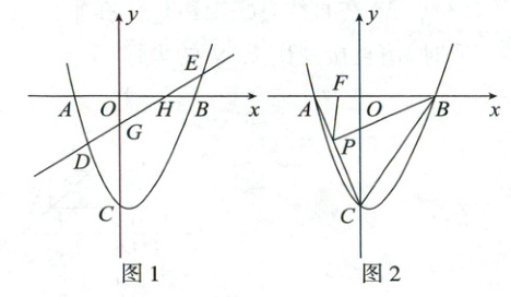 (2)如图1,$ D(-1,n) $在抛物线上,过$ D $点的直线$ l:y = kx + b $交线段$ OB $于点$ H $,交$ y $轴于点$ G $,交抛物线于点$ E $,若$ DG + EH = 2GH $,求$ k $的值.