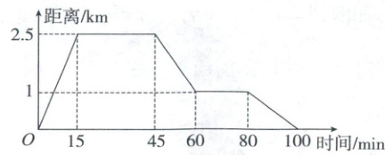2.C [解析]一次函数图象的应用 对于A,小明家到体育馆的距离为2.5km,故A错误.对于B,小明在体育馆锻炼的时间为45−15=30(min),故B错误.对于C,小明家到书店的距离为1km,故C正确.对于D,小明从书店到家步行的时间为100−80=20(min),故D错误,故选C;