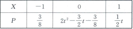 4.BC【解析】离散型随机变量的分布列+离散型随机变量的数学期望与方差+离散型随机变量的方差的性质 由题意可知$\frac{3}{8}+(2t^2-\frac{3}{2}t-\frac{3}{8})+\frac{t}{2}=1$,即$2t^2 - t - 1 = 0$(题眼)(提示:离散性随机变量的分布列的性质,即概率之和等于1),解得$t = 1$或$t = -\frac{1}{2}$。又$\frac{t}{2}\geq0$,即$t\geq0$(易错:注意概率的取值范围为$[0,1]$),所以$t = 1$。故A不正确;因为$E(X)=(-1)×\frac{3}{8}+0×(2t^2-\frac{3}{2}t-\frac{3}{8})+1×\frac{t}{2}=-\frac{3}{8}+\frac{1}{2}=\frac{1}{8}$,故B正确;因为$D(X)=(-1-\frac{1}{8})^2×\frac{3}{8}+(0-\frac{1}{8})^2×(2t^2-\frac{3}{2}t-\frac{3}{8})+(1-\frac{1}{8})^2×\frac{1}{2}=\frac{55}{64}$,故C正确;$D(8X + 9)=8^2D(X)=64×\frac{55}{64}=55$(提示:方差的性质$D(aX + b)=a^2D(X)$),故D不正确。故选BC。