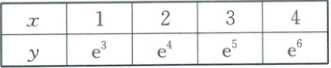 3.D 【解析】非线性回归方程+预测值 令$z = \ln y$,则$z = \frac{x}{5} - a$,可得$z$关于$x$的数据如下表,所以$\bar{x} = \frac{1}{4} × (1 + 2 + 3 + 4) = \frac{5}{2}$,$\bar{z} = \frac{1}{4} × (3 + 4 + 5 + 6) = \frac{9}{2}$.又$(\bar{x},\bar{z})$的坐标必满足回归方程$z = \frac{x}{5} - a$,所以$\frac{9}{2} = \frac{1}{5} × \frac{5}{2} - a$,解得$a = - 4$,所以$\hat{y} = e^{\frac{x}{5} + 4}$.当$x = 6$时,$\hat{y} = e^{\frac{6}{5} + 4} = e^{\frac{26}{5}}$,即预估第6个月的预制菜市场规模是$e^{\frac{26}{5}}$万元.故选D.