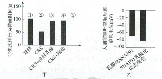 (1)据图分析,图中的自变量是小鼠类型和对CRS的处理情况,因变量是非焦虑样行为持续时间,图甲实验①②③组中,对照组的非焦虑样行为持续时间最长,CRS组明显缩短,CRS+注射乳酸组非焦虑样行为持续时间较CRS组增加,说明注射乳酸能够缓解CRS小鼠焦虑行为;为了进一步证明运动产生的乳酸能缓解CRS小鼠焦虑行为,还需要增加一组实验[特别提醒:实验设计遵循对照性原则、单因子变量原则,以排除无关变量对实验结果的干扰],即CRS+乳酸生成抑制剂(DCA)+跑动。