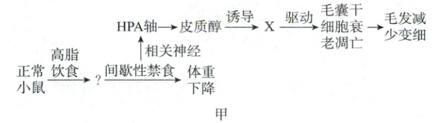 24. (12分)相对正常进食,间歇性禁食能有效控制体重,改善代谢,防止肥胖,但也会抑制毛发生长甚至引起秃头。科研人员利用小鼠进行研究得出相关调控机制如图甲,回答下列问题: