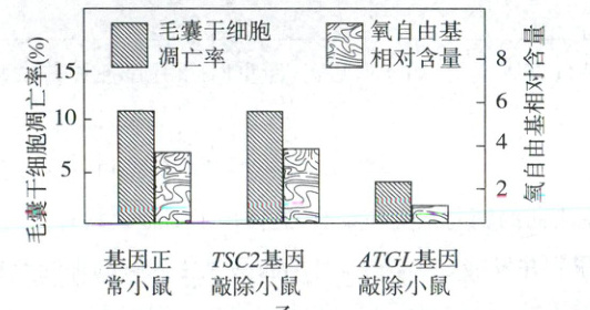 。(2)对基因正常小鼠、葡萄糖代谢相关的TSC2基因敲除小鼠和脂肪酸氧化相关的ATGL基因敲除小鼠进行间歇性禁食处理,检测毛囊干细胞凋亡率和线粒体氧自由基相对含量,结果如图乙。图中基因正常小鼠组起
