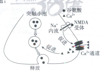 (填物质)增加,进一步促进谷氨酸的释放,促进对$NMDA$受体的刺激,导致更多的谷氨酸堆积在细胞之间,造成细胞损伤。(3)某种药物作用于细胞可减少突触间隙的谷氨酸数量,达到缓解病症的作用。据图分析,该药物作用的机制可能是