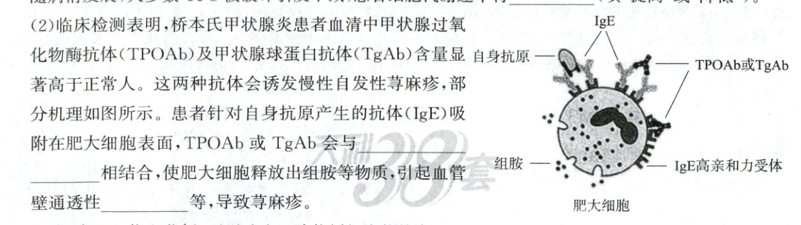 (2)由题图可知,当相应抗体吸附在肥大细胞表面时,TPOAb或TgAb会与IgE、IgE高亲和力受体结合,使肥大细胞释放出组胺等物质,引起毛细血管壁通透性增强,导致荨麻疹。