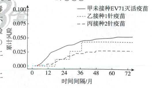 15. 手足口病可由肠道病毒71型(EV71)、柯萨奇病毒A16等感染引起,常见于5岁以下儿童。如图表示不同疫苗接种情况的儿童手足口病二次感染的累计风险随时间变化的曲线。下列叙述错误的是(