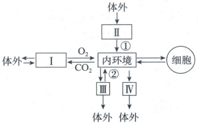 20. 如图表示人体细胞与外界环境之间进行物质交换的过程。Ⅰ、Ⅱ、Ⅲ、Ⅳ表示能直接与内环境进行物质交换的4种器官或系统,①②表示有关的生理过程。下列有关说法错误的是(